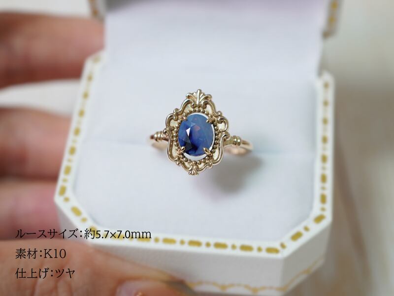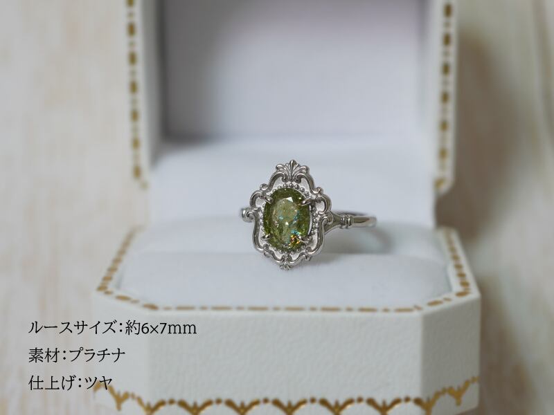 アンティークミラーリングにカラーストーンをセットする際、中央の装飾フレームのサイズは固定となっており、ルースの大きさに合わせた調整は行っておりません。