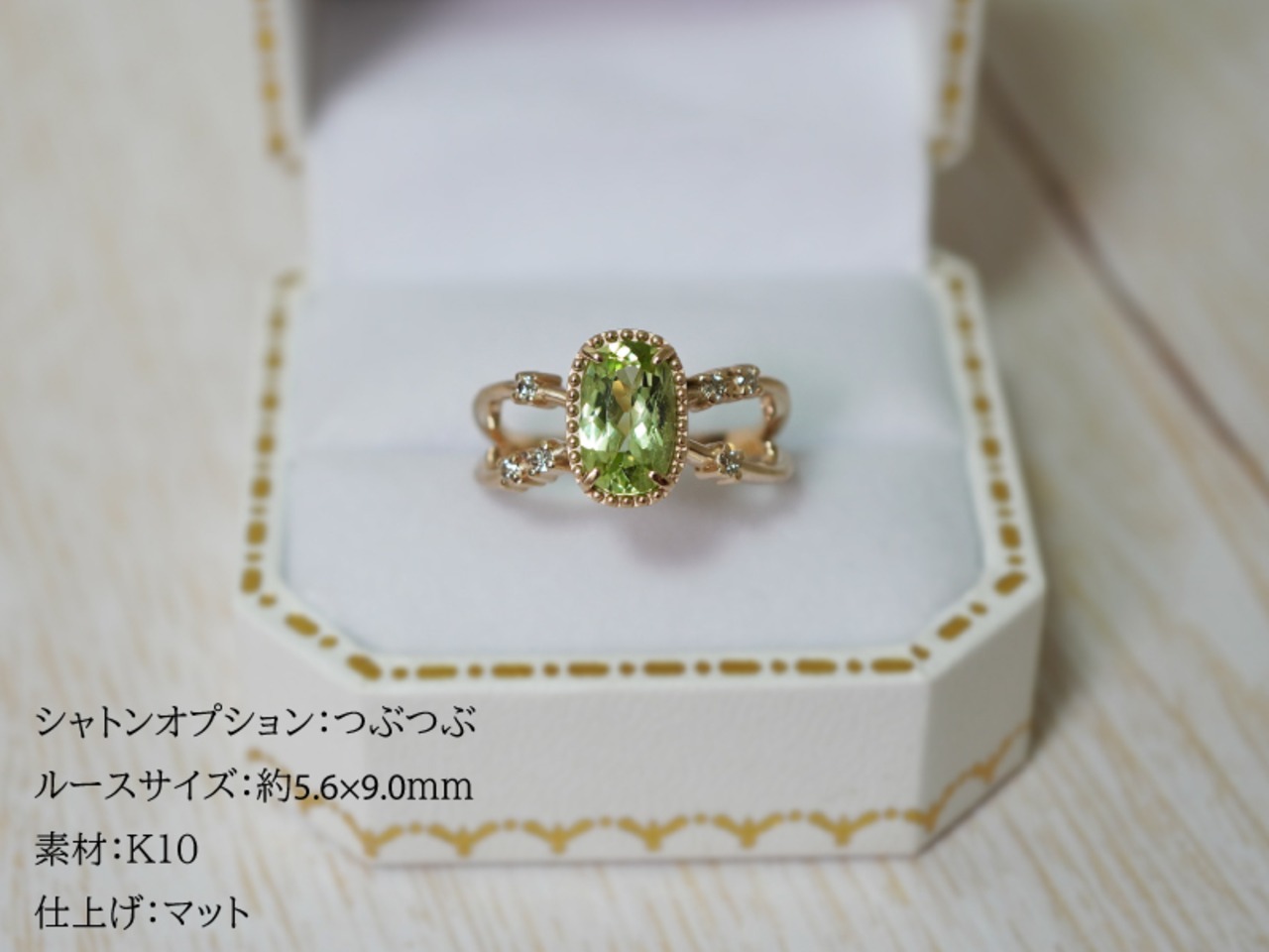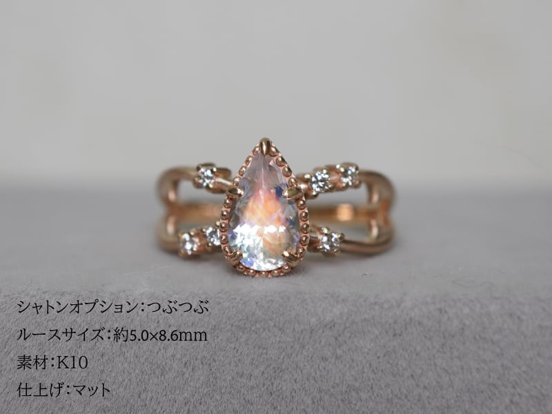 ルースのまわりをぐるりと囲むように、小さな粒を丁寧にあしらったシャトン(石座)。
