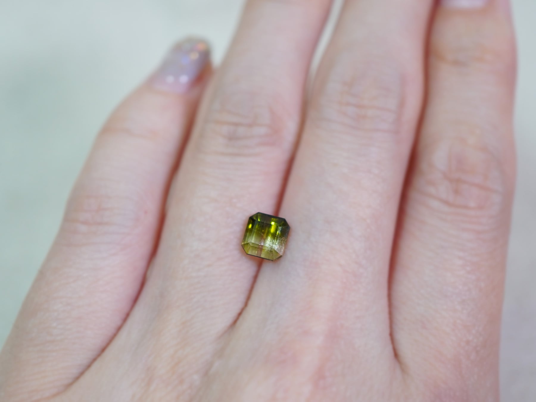 抹茶を思わせる落ち着いたグリーンと、透明感のあるクリアカラーが美しく並ぶ、バイカラートルマリンです。