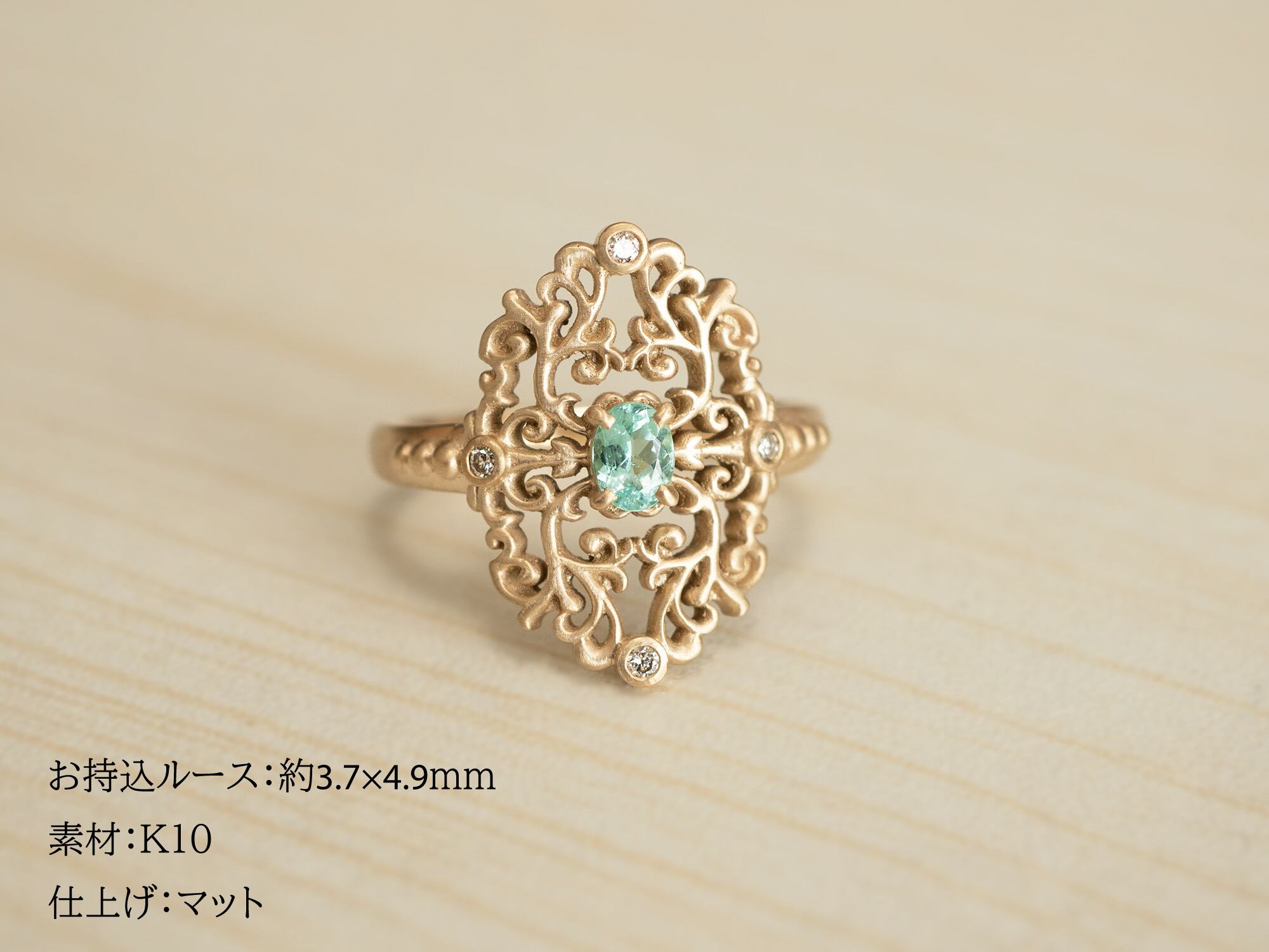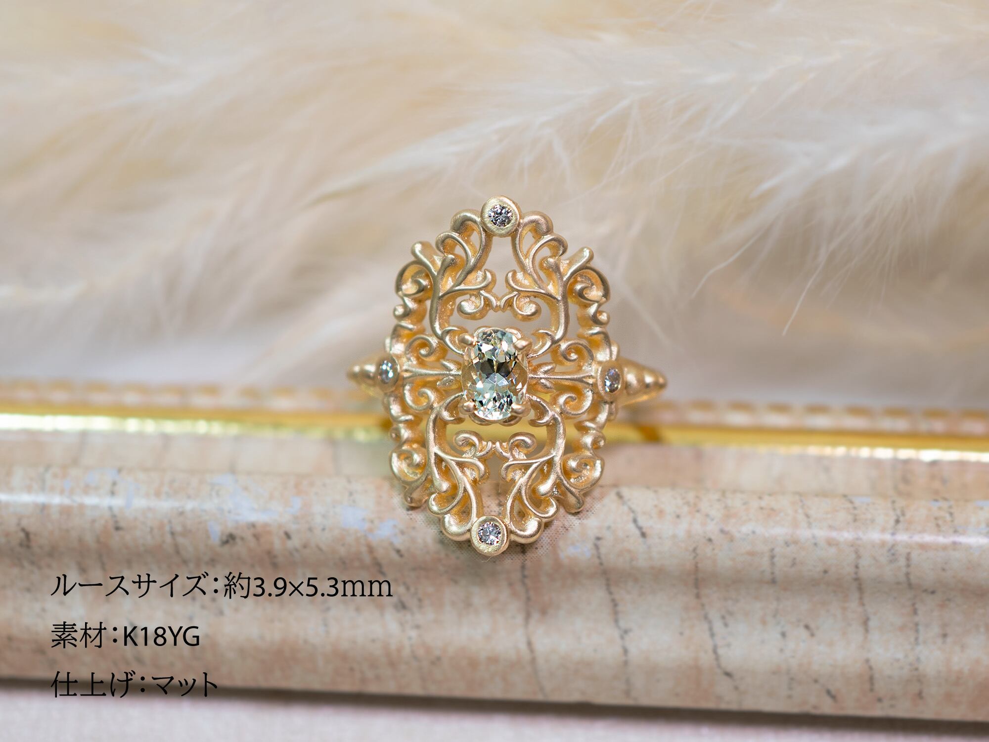 リング全体に施されたダマスクデザインの透かし模様は、光を透過させることで繊細な陰影を生み出し、指元に上品な輝きを添えます。