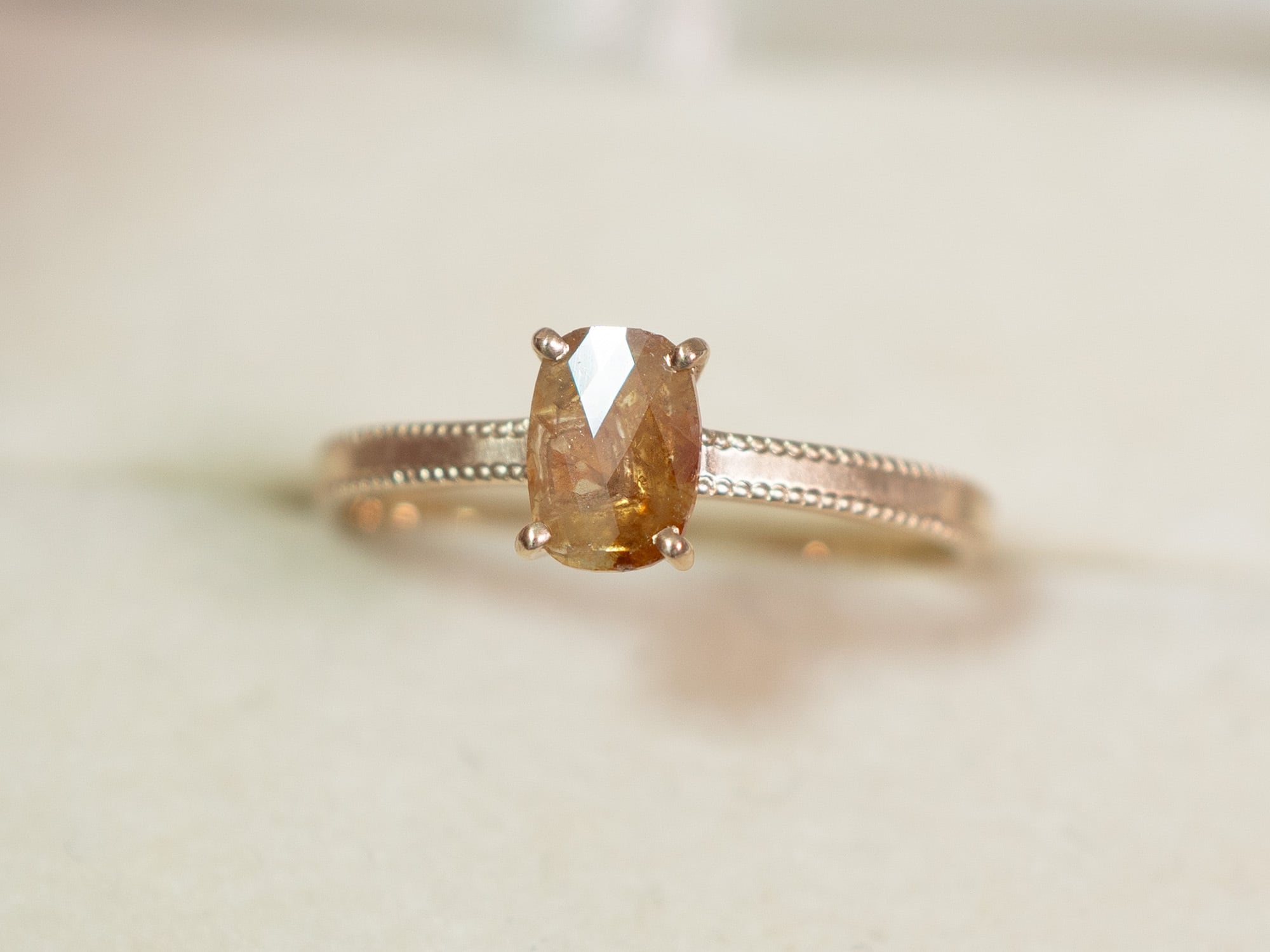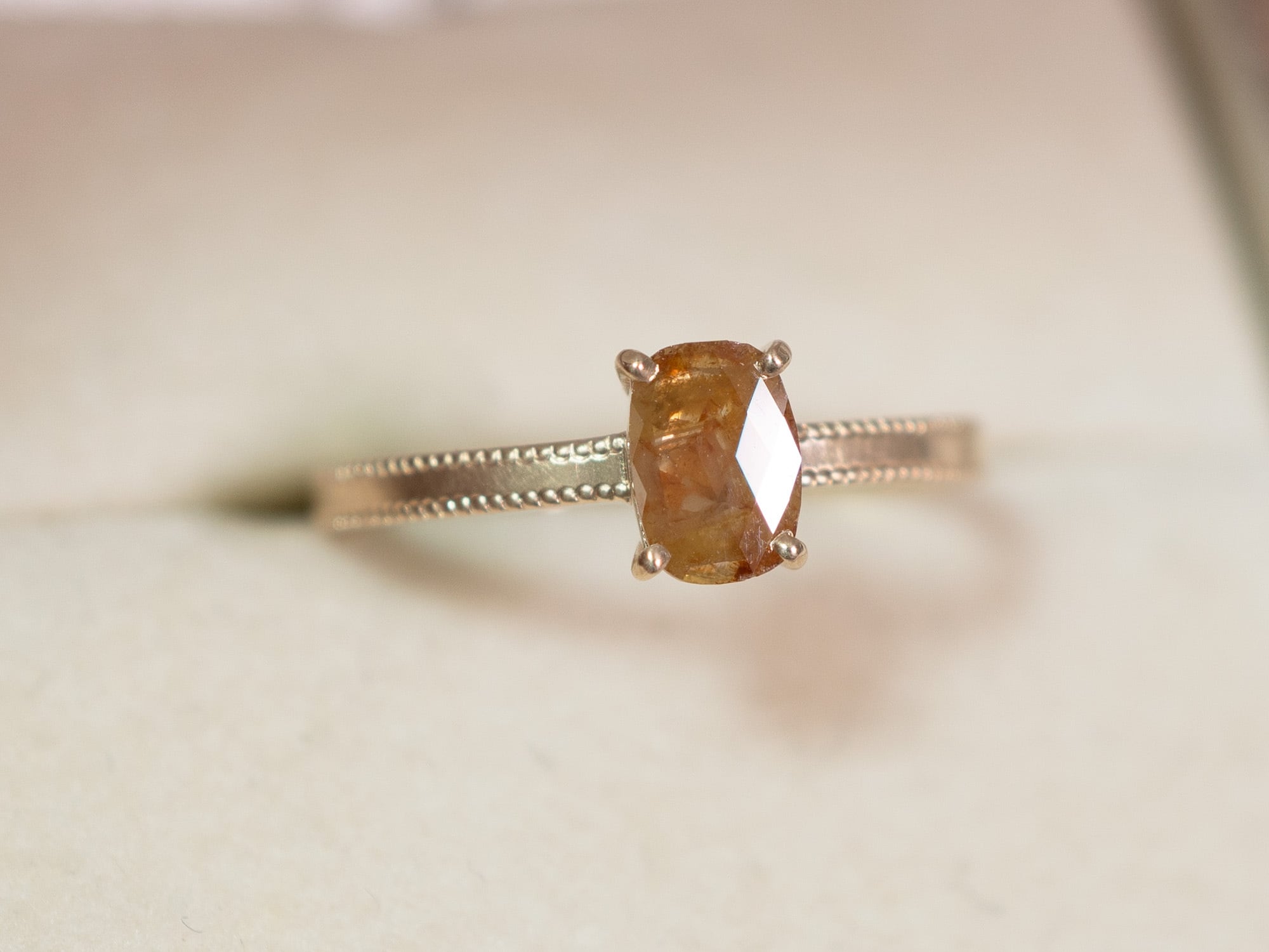 上下に施された緻密なミル打ちが施されたリングに、キャラメルブラウンのダイヤモンドを合わせました。