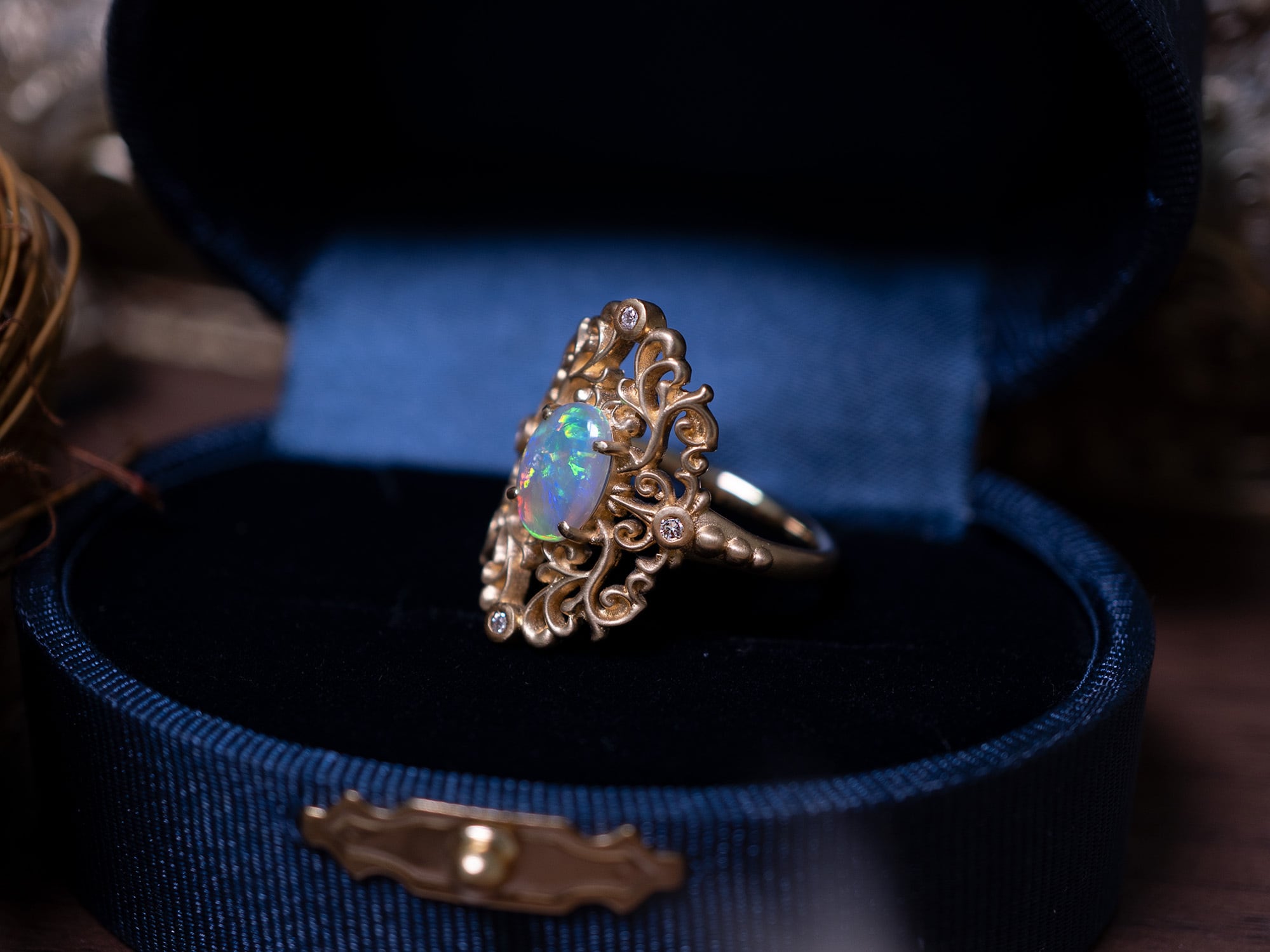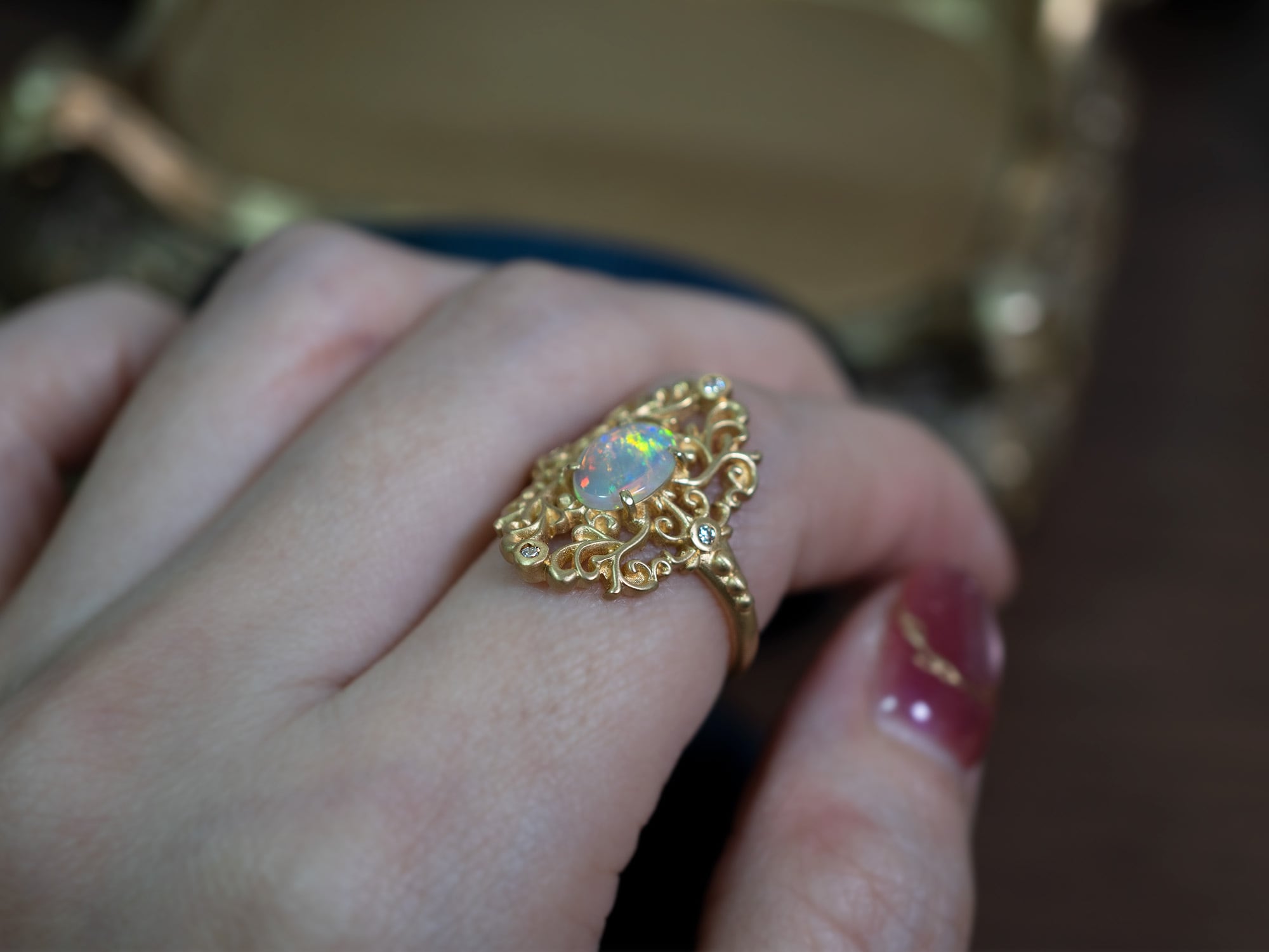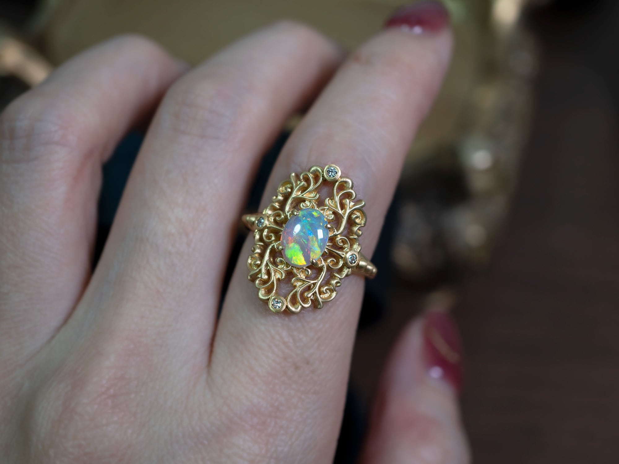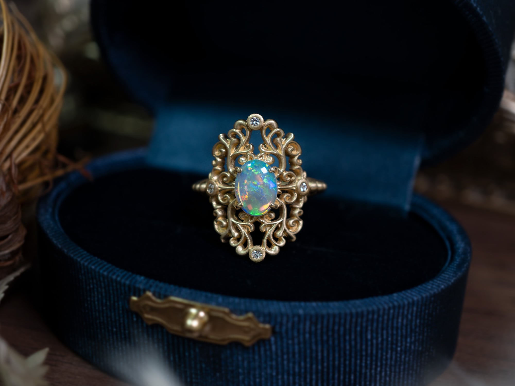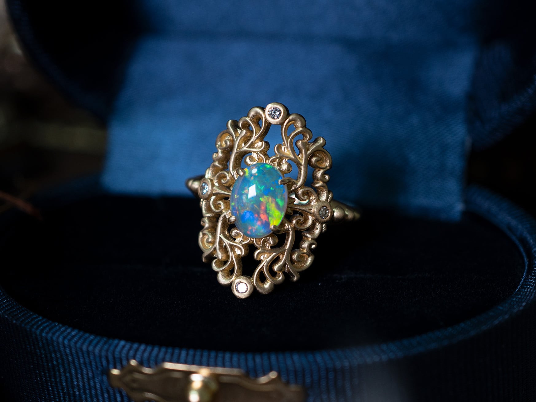 繊細なダマスク模様の透かし装飾に、神秘的な光を宿すオーストラリア産クリスタルオパールを合わせました。
